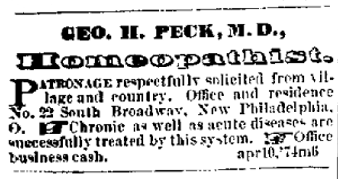 Previous Image Next Image 1874-5-8 new-philadelphia-ohio-democrat-May-08-1874-p-1 George H. Peck’s earliest advertisement in the New Philadelphia, Ohio newspaper, 1874.