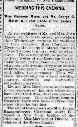 During the first decade of the 1900s Florence started becoming active in a number of community organizations, one of which included the Womans Club. She frequently presented at the club on issues related to history, current events and the future of the club. Subjects she presented to the club included the Franco-Prussian War, Knighthoods, and German Literature. She married newspaper foreman, and future printer, George Canfield Marsh on August 6, 1902. They subsequently moved into their first home on the 300 block of West Ray Street, New Philadelphia.
