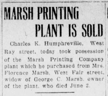 Florence’s husband was a prominent man in his own right. George Marsh had learned the printing trade working for newspapers in New Philadelphia and ultimately opened his own firm, the Marsh Printing Company on East High Street. George Canfield Marsh passed away unexpectedly in June 1926, he was only 52 years old at the time. The Marsh Printing Company was sold by Florence Marsh a month after her husband’s death to New Philadelphia resident, Charles Humphreville in July 1926.