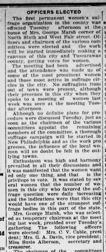 Florence was not just attracted to cultural organizations, but political ones as well. She was elected second vice president of the Tuscarawas County Drys, a temperance organization, in November 1911. It was shortly after this that Florence and George Marsh purchased the home of the late Abraham Patrick on the corner of West Fair Avenue and Sixth Street (now 3rd Street NW). Florence began holding prayer meetings in the home as early as May of 1912. Florence was appointed to a committee to establish the YWCA in New Philadelphia in July 1912 and shortly after that she was named Chairman of the New Philadelphia Suffrage Organization. Shortly afterwards, the first official meeting of the group took place at Florence Marsh’s home. This meeting meant that my home was the home of the beginnings of the suffragist movement in Tuscarawas County, Ohio.