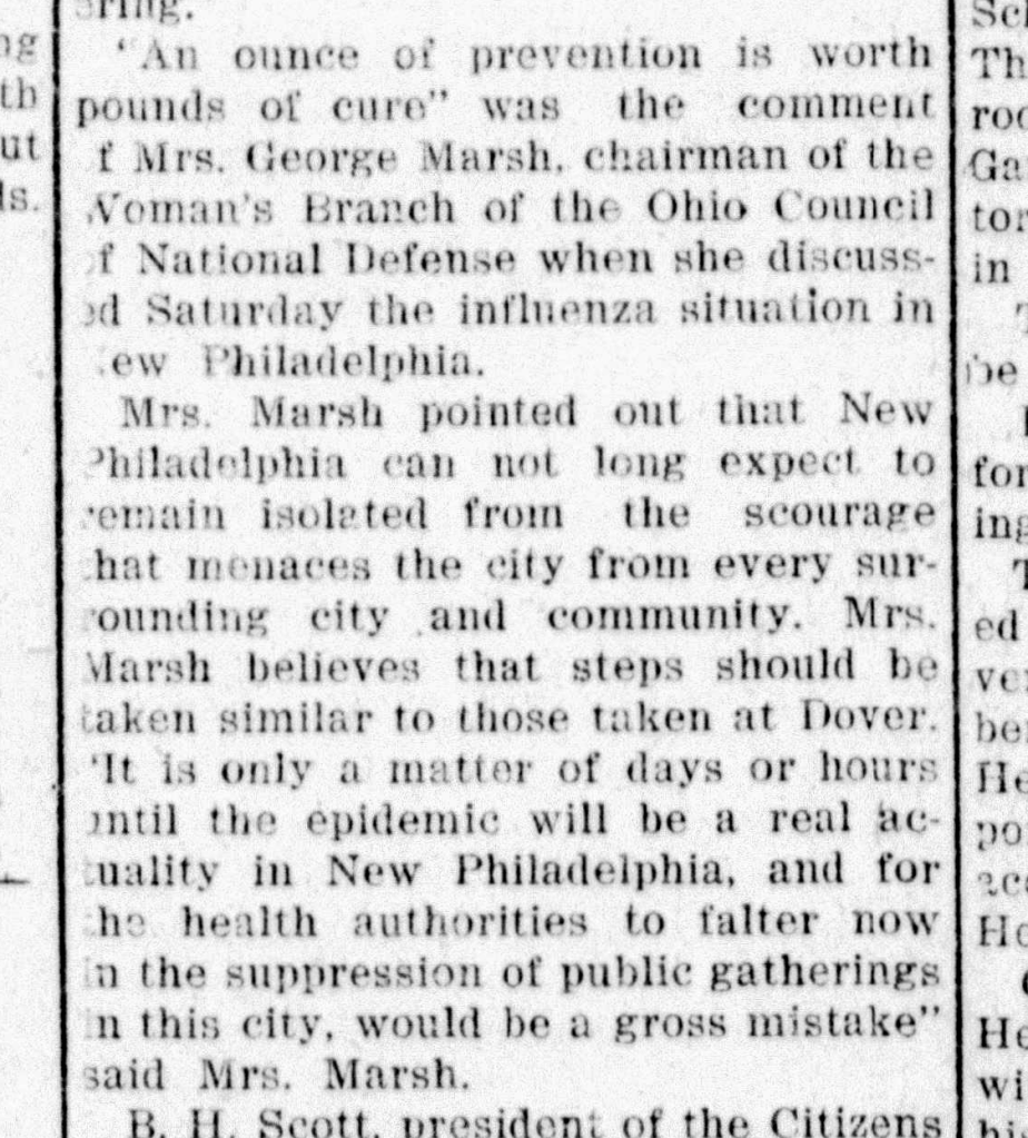 It will come as no surprise that once the United States entered World War One that Florence directed some of her energy towards supporting the war effort. She became the chairperson, in July 1918, of an organization in Tuscarawas County that would organize women to undertake all manner of work that would benefit the effort. By October 1918 the Spanish Influenza had come to Ohio and Florence Marsh, as chairperson for the Women’s Branch of the Ohio Council for National Defense was educating the community of the dangers the influenza outbreak. Florence also found herself volunteering with the local Red Cross during this period as well.