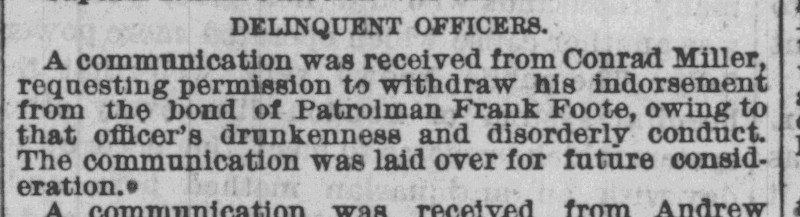 At some point, and whether by choice or by necessity is unknown, Frank Foote, Jr. left the police department and entered the family business of operating a saloon. Probably not the best decision for a man battling his own demons with alcohol. Unfortunately for him, he was about to battle another demon, the untimely death of his 6 year old son Frank in 1881. Whether the death of his young son exacerbated Frank’s drinking or merely gave him one more excuse is impossible to know, but he would only outlive his son by three years.