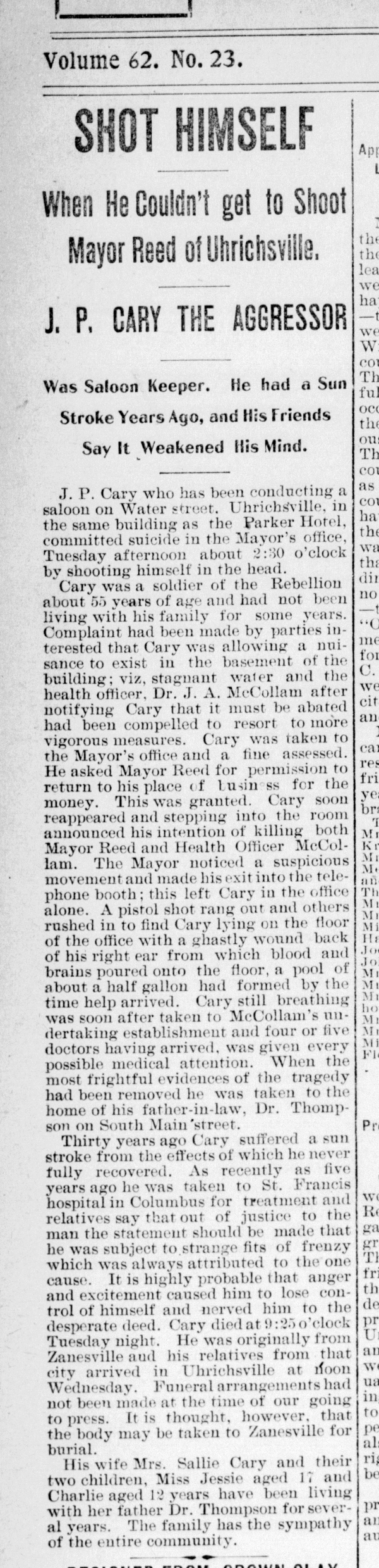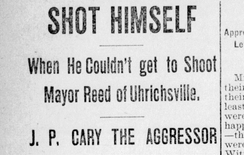 John Cary shot himself in the Mayor of Uhrichsville’s office over a small fine for minor health infraction at his saloon. That John had struggled with his mental health was apparently well known in the local community. He was not villainized for his intent to murder two prominent members of the community; rather, the newspaper account of his death was empathetic to him and his family. John’s family arrived from Zanesville the following day to make arrangements for his funeral.