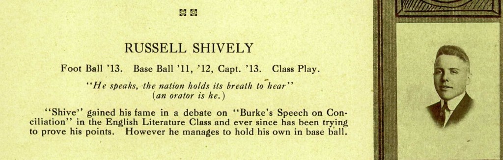 One of my mantras is that every person, historical or living, has a story to tell us. Occasionally, just to remind myself of that, I look for a random person in a historical record and dive into their life to discover their story. The other day I found myself virtually leafing through the 1913 New Philadelphia High School Yearbook and decided to put my mantra to the test yet again. This is the short story of Russell Lowell Shively (1895-1918), an athlete, medical student, soldier, and humanitarian.
