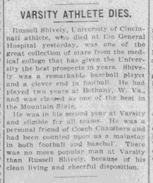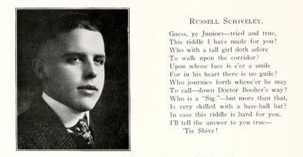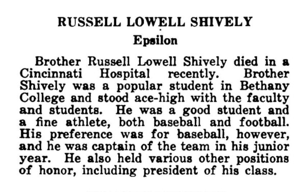 Russell attended New Philadelphia High School, graduating in 1913, where he was an active and accomplished athlete and student. While he played football, he excelled in baseball and served as the team’s captain his senior year. Nicknamed “Shive”, Russell determined to continue his education after high school by attending Bethany College in Bethany, West Virginia.