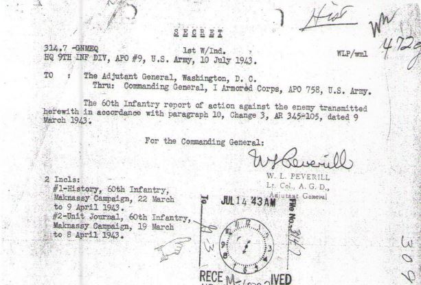 The 60th Infantry Regiment advanced along with the rest of the Allied force as it fought its way eastward towards Tunisia in the late winter and early spring of 1943. The regiment would play a very active role in the engagements that permitted that advance, culminating in what was Private Rose’s last battle, the Battle for El Guettar, Tunisia.
