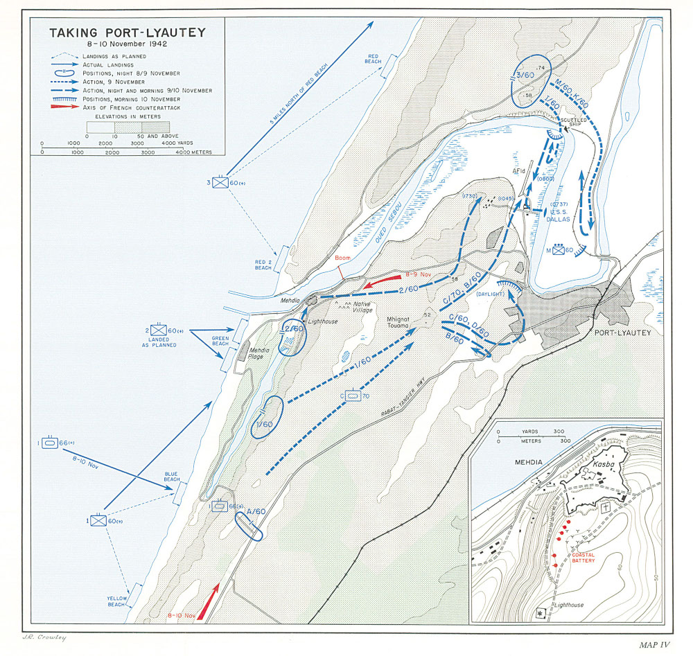 John Rose’s battalion, part of the Northern Attack Group, came ashore the morning of November 8, 1942 at “Green Beach” just in front of the village of Mehdya, Morocco at the mouth of the Sebou River. The group’s objective was the inland town of Port-Lyautey and a small airfield nearby. The attackers met strong resistance from the French defenders of a nearby fortress and the airfield. It took the attack group three days to finally secure the capture of the town and arrange a truce with the defenders.