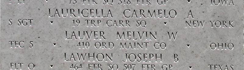 Anita Jean Lauver received a telegram from the War Department on Saturday, 11 September 1943, notifying her of the death of her husband and his burial at sea. A letter followed later that may have included details on the injury Melvin suffered. Melvin W. Lauver is memorialized on the Tablets of the Missing at the National Memorial Cemetery of the Pacific in Honolulu, Hawaii.