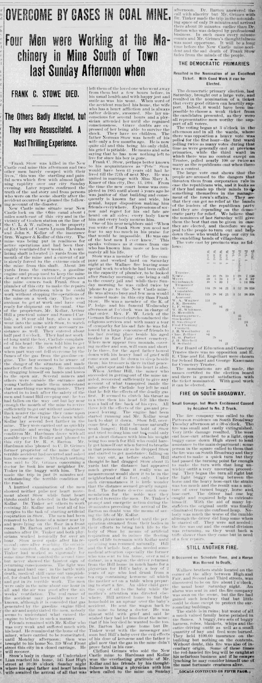 Frank C. Stow (1858-1901) wore many hats in his short life. He worked as a plumber at the time of his death, but had been a general laborer, the Courthouse janitor, a constable, the jailer, a fireman, as well as being reported an excellent dancer. Frank was very active and liked in the community, but an avoidable accident in the New Castle Coal Mine ended his life and his legacy.