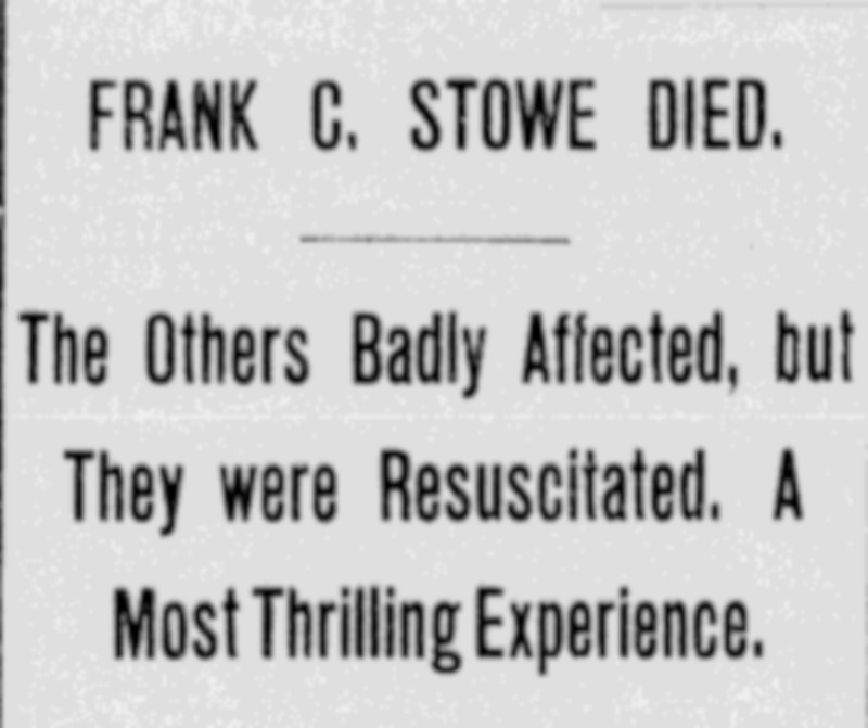 The miners discovered the unconscious bodies of Frank Stow and the third man, one of the owners of the mine, when they entered as far as the gasoline engine. The men were dragged out of the mine and a call was made for doctors to come to the mine right away. A half-hour later the doctors arrived and determined that the third man was still alive but that Frank Stow had died. It was determined that all four men had suffered from carbon monoxide poisoning from the gasoline engine.