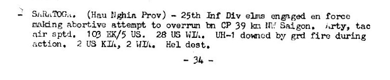 Operation Saratoga was a search and destroy operation that took place in provinces near and along the Cambodian border, northwest of Saigon. The operation was undertaken by elements of the 25th Infantry Division, with support from other necessary units including the 240th. The operation started in early December 1967 and ended in the first weeks of March 1968.