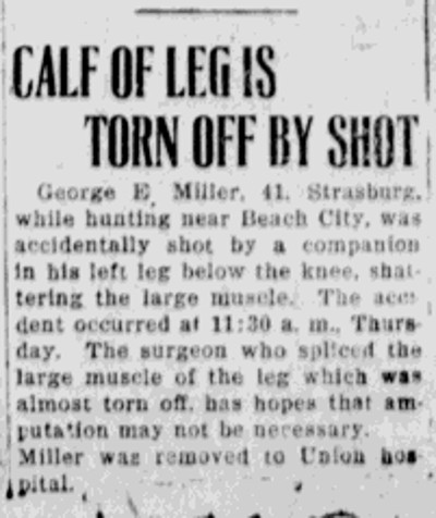 Thanksgiving Day 1925 George Miller, and a number of friends, grabbed their shotguns and headed out hunting for the day. While George was walking through the woods with his hunting party around 11:30 am, a companion accidently discharged both barrels of his shotgun into George’s left leg. The rounds tore through George’s leg, just below the knee, severely damaging the muscle and bone. George was taken to Union Hospital in Dover where doctors worked to save his leg, and his life. Doctor’s amputated George’s leg above the knee, but the wound was too severe and George died a day later. Loren was six years old.