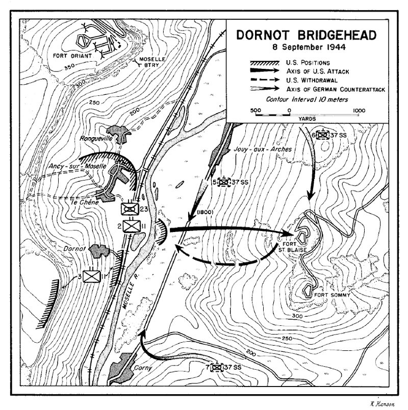 The 11th Infantry Regiment, beginning on September 8, 1944, was tasked with crossing the Moselle and establishing a beachhead on the east bank on the outskirts of Metz. The American commanders who ordered the cross-river assault were unaware that many of the fortifications and defensive positions had been reinforced by the Germans during the period that the Americans were resupplying. The 11th Infantry Regiment met fierce resistance from German units and was forced to withdraw back across the Moselle on the evening of September 10, 1944, after holding the beachhead for 60 hours. The regiment lost 363 killed and wounded, among which was Staff Sergeant Loren R. Miller.