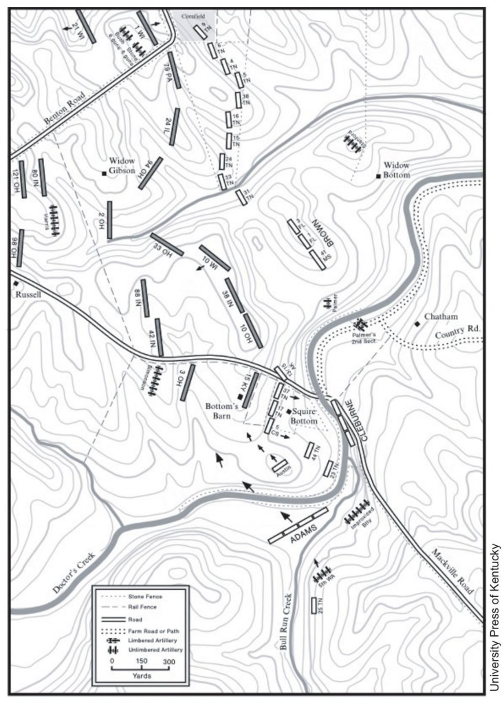 William’s company, along with the rest of the 98th regiment, marched October 1st until the 8th to Perryville, Kentucky. The regiment was attached to Colonel George Webster’s 34th Brigade, 10th Division, 1st Army Corps of the Army of the Ohio. The Army of the Ohio engaged with forces of Confederate General Braxton Bragg’s Army of the Mississippi at Perryville on October 8, 1862 and William Bennet received his first, and last, experience with combat.