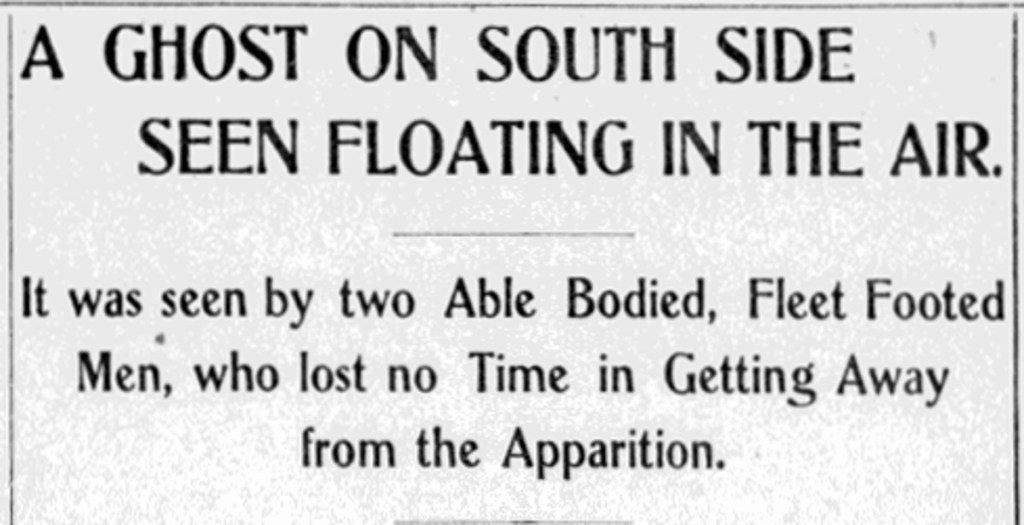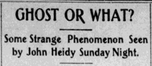 A month later, south side resident John Heidy (1855-1943) was travelling along the Goshen Road on horseback about a half-mile south of the mill pond where the previous witnesses had seen their apparition. Heidy, like the other two witnesses, had worked in a variety of jobs on the south side over his lifetime including coal mining, teamster and handling odd jobs. It was, again, nearing dusk, when the Heidy had his encounter with a “strange phenomenon.”