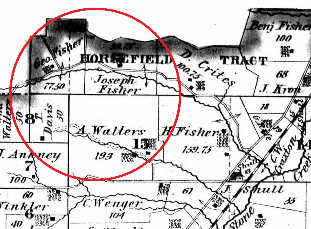 Location of the George Fisher and Abraham Walters farms in York Township, 1875. On what is modern Baker Road.
