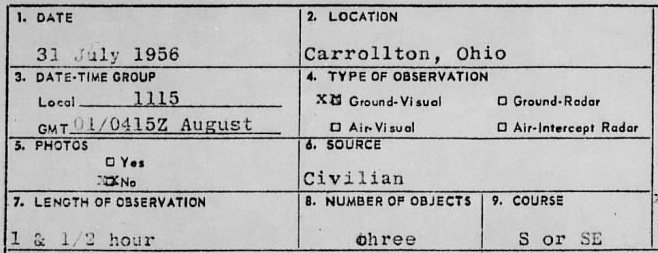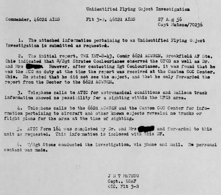 The next day the doctor contacted the Air Force Station in Brookfield, Ohio to report what he and the other witnesses had seen. The non-commissioned officer who took the doctor’s report passed the information on to the Project Blue Book team. Questionnaires were sent to the witnesses in early August 1956 and were filled out and returned by the end of August. Additionally, Project Blue Book researched local flight records and weather data to see if perhaps they had been the source of the objects witnessed by the doctor and his family members.