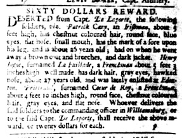 . . .Deserted from Capt. Le Laporte, the following soldiers, viz. Patrick Cary, an Irishman, about 5 feet high, has chestnut coloured hair, round face, blue eyes, flat nose, small mouth, has the mark of a sore upon his leg, and is about 26 years old; had on when he went away a brown coat and breeches, and dark jacket. . .