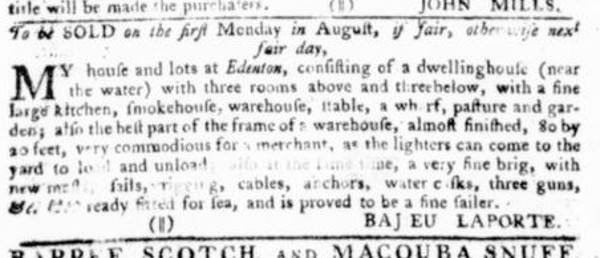 Bejeau Delaporte returned to his business of importing European goods from his store, along with his new partner Galvan Debernoux, in Edenton. Their store offered customers everything from French pins to German steel, as well as a variety of English manufactures. Ships from Bordeaux and Cadiz called at Edenton with goods for Delaporte’s store. However, business in Edenton must not have been what Delaporte expected, for in June 1779, he advertised that he was selling his “top gallant sail schooner” of 50 tons burden. A week later Delaporte advertised for the sale of his house and lot in Edenton. Not having met with much success in North Carolina, Delaporte returned to Williamsburg. Using his old rank as part of his advertising campaign, he advertised in June of 1779 that his old Russian friend from his days on Martinique, Theodore Karjavin, was offering language lessons from Delaporte’s store “next door to Mrs. Vobe’s.” “Captain Delaporte” moved his store to “the house lately occupied by Mr. Beall” in October 1779, where he offered “rum by the gallon” among other items. Delaporte operated his store in Williamsburg until at least May of 1780, when he advertised that a man named Thomas Andrews had purchased over twelve thousand pounds worth of goods with a fraudulent draft on the state treasury. Shortly after this event, Delaporte once again was on the move, opening a store in Fredericksburg with his old business partner Bernoux. Bernoux, deciding to return to France, left the business in Fredericksburg entirely in the hands of his partner in September 1780. Delaporte apparently oversaw the business, then known as Laporte, Galvan and Company, until his death in 1782 when the “dry goods, household furniture and a schooner, late the property of Bajieux Laporte, deceased” were offered for public sale.