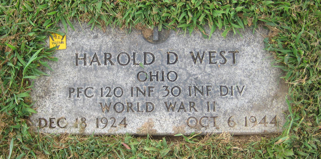 The following morning the regiment received heavy barrages of artillery fire and was counterattacked by a company of German infantry. The counterattack was repulsed but among the 120th’s killed that day was Private Harold Dean West. Private West was temporarily buried in Holland, but his remains returned home to Ohio for burial in December 1947. He is laid to rest at Evergreen Burial Park in New Philadelphia. Harold’s brothers survived the war.