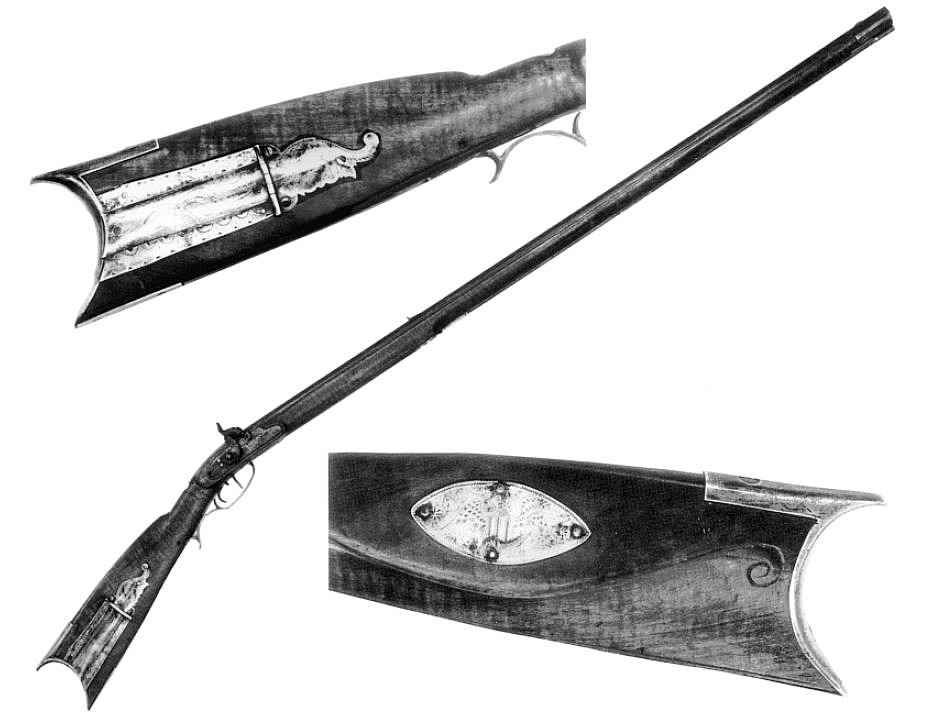 Abraham Schweitzer (1769-1831) learned the trade of gunsmithing as a youth in the seminal region for Pennsylvania long rifles, Lancaster County, Pennsylvania. Schweitzer eventually settled in Chambersburg, Pennsylvania by the late 1780s and established himself on the north-east corner of the intersection of Front and King Streets in 1805. It is likely in this shop that Frederick and George Biddle served their apprenticeships in the “Chambersburg School” of gunsmithing. Joe Kindig. in his book Thoughts on the Kentucky Rifle in its Golden Age, identifies a number of traits typical of firearms of this school including low straight combs, beautiful patch boxes, much inlay, and well executed relief carving. Four excellent examples of Abraham Schweitzer’s work are presented in Kindig’s book.