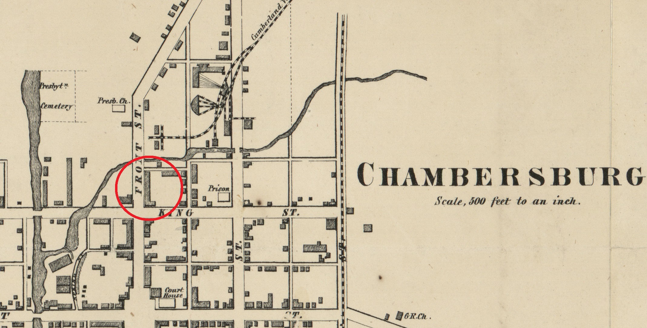 The location of Abraham Schweitzer’s gunsmith shop, where Frederick and George Biddle served their apprenticeships, in Chambersburg, Pennsylvania. (Source: https://www.loc.gov/item/2012592178/)