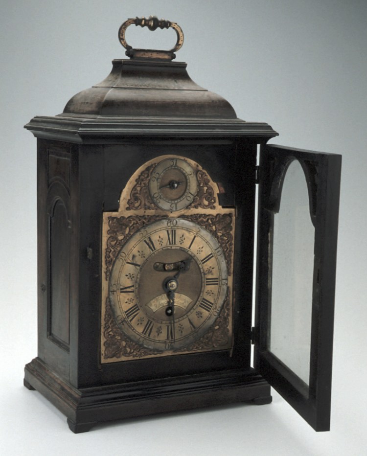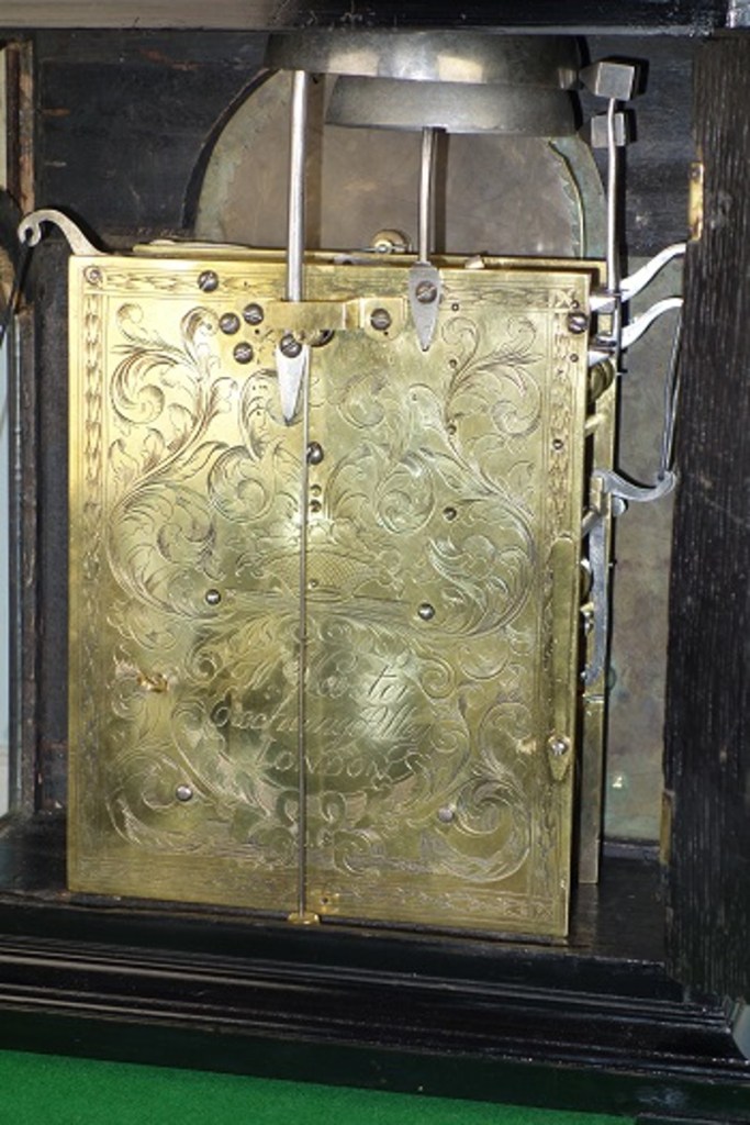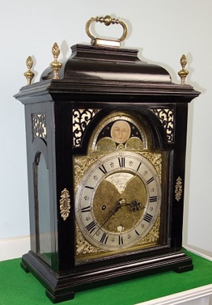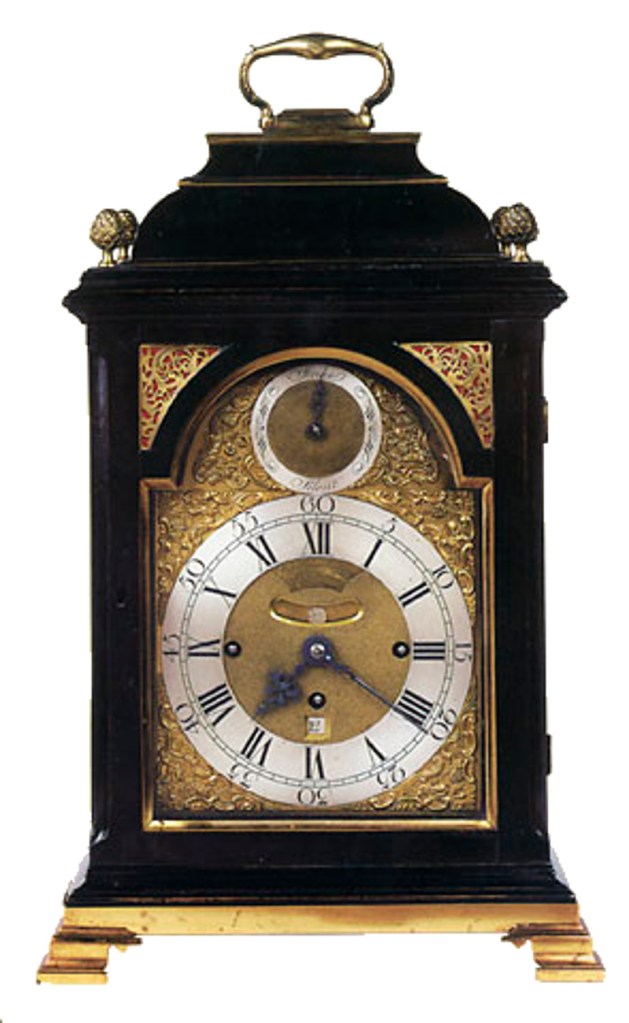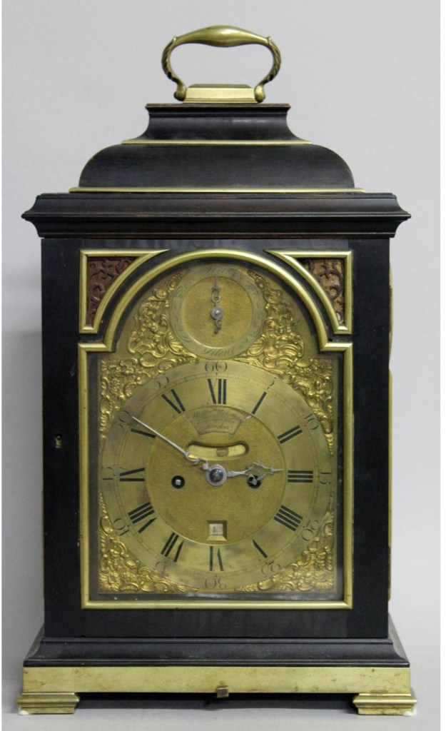 The first thing I wanted to do was to determine something about the clock itself. Who was the maker? When did he work? Would those facts support the provenance provided by the seller? The clock is a type of shelf clock commonly referred to as a “bracket” clock. These clocks have their roots in early hanging clocks, but took their more common form in the 17th and 18th centuries. This common form included often ornate designs, typically hardwood cases with burled finishes and molded bases. The dials of the clocks were engraved, often silvered, and sometimes included subsidiary dials as well. The dials were then surrounded with decorative cast spandrels.