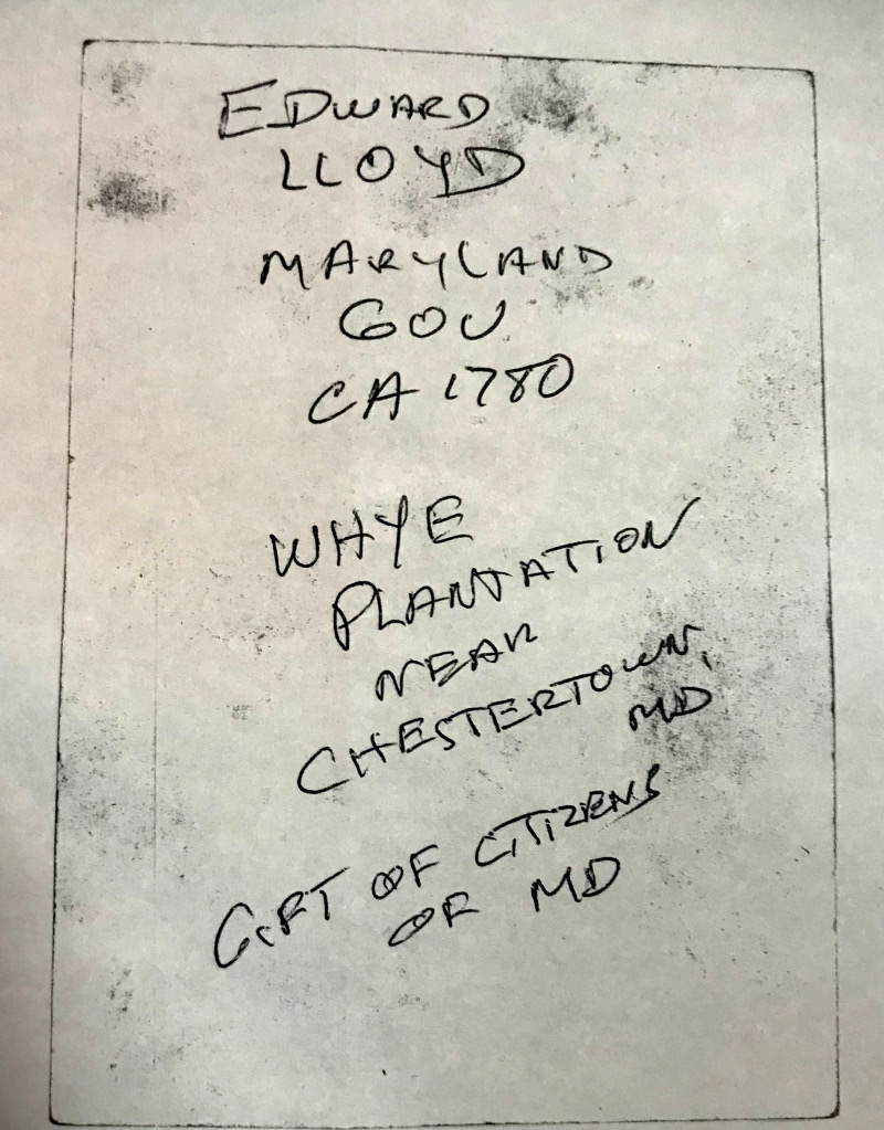 The Lloyd family’s plantation in Talbot County, Maryland, called Wye Plantation (or Wye House), was originally built in the last half of the 1600s. The original house suffered a catastrophic fire sometime in the early 1780s and a new home was constructed after that (bet. 1781-1790). That house survives. There is an inventory mentioned in a recent master’s thesis about the furnishings of Wye Plantation before the fire, c. 1770, which states that there were two clocks; an “old” one valued less than £1 and another valued at £8. According to one source, the family provided a list of items destroyed in the fire so as to limit the amount of tax they would have to pay. The source stated that this document is in the family’s hands still but I have not been able to locate a copy. Was this Webster clock damaged in the fire that destroyed Wye House in the early 1780s? Does the c. 1780 date reference the date of the fire? Possibly.