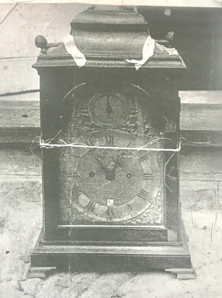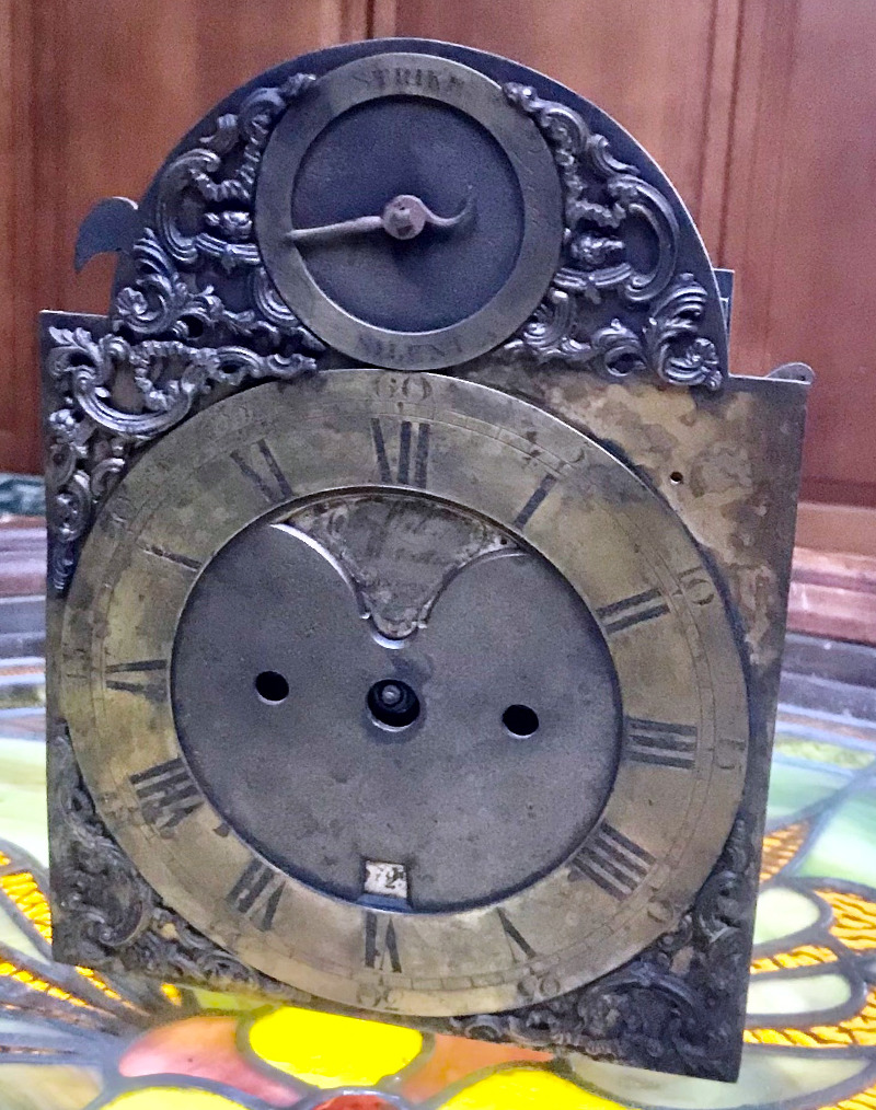 My friend told me that he had acquired the movement, and what was left of the case, at an antique show decades ago. According to the man who sold the clock, it had belonged to Edward Lloyd, an early Governor of Maryland. The clock was allegedly a gift to Lloyd from the “Citizens of Maryland” and was damaged in a later fire. This provenance included a c. 1780 date and the name of the Lloyd plantation, all scrawled on the back of a photograph of the damaged clock. An interesting clock, with an equally interesting provenance, worth examination.