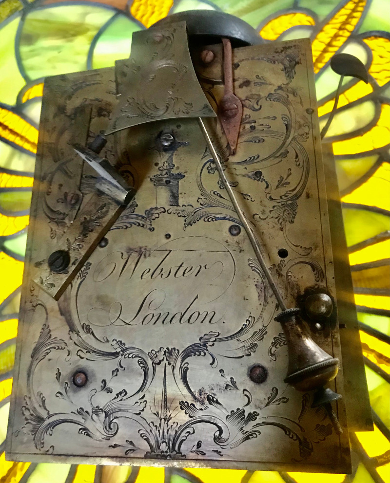 After the founder’s death the “Dial and Three Crowns” then passed to a son, also named William Webster. This William Webster was apprenticed to his father and he eventually became a Master of the Clockmakers Company in 1755. This William Webster died in 1770 and he left the business to his two sons, William and Richard. The son William died soon after his father, in 1779, and the business then passed to his brother Richard. Richard was a terrible businessman, and gambler, who ended up ruining the family business. Given the above history of the Webster clockmaking business, my friend’s Webster clock must date to sometime between 1711 and 1779.