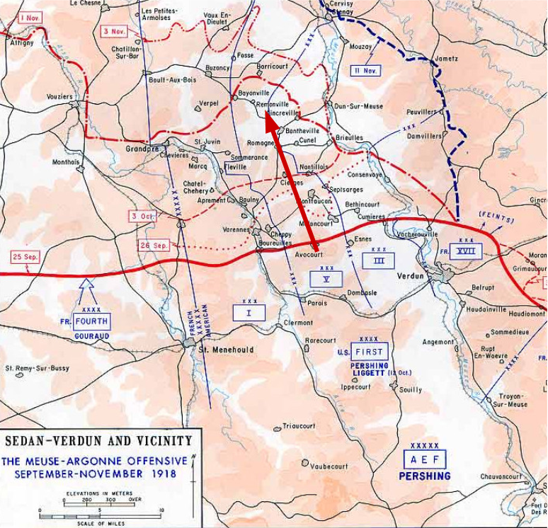 Upon his arrival in France Private Carr was assigned to a machine gun company in the 11th Infantry Regiment. That regiment was part of the United States Army’s 5th Infantry Division, part of the Army’s First Corps. The 11th Infantry Regiment was initially stationed near Chaumont, France and saw service in the Vosege Moutains and combat at Frapelle during the summer of 1918, and then the Battle of Saint-Mihiel in September. Through these trials, Private Carr managed to avoid being wounded despite his unit being heavily engaged and the use of mustard gas by the Germans.