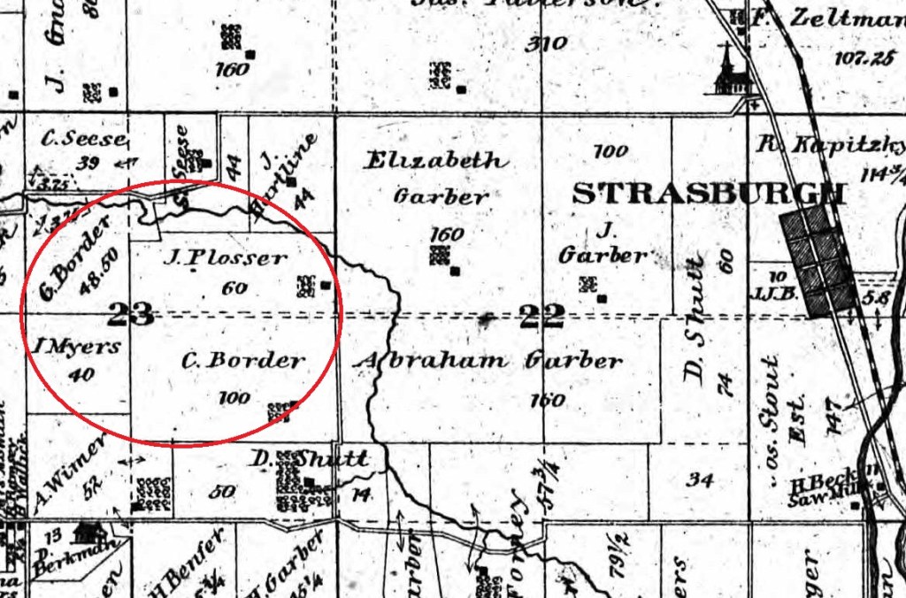 The Border family can trace their Tuscarawas County roots back to the arrival of Christopher Border (1800-1856) and his family from Germany around 1833. They originally settled in Wayne Township in Tuscarawas County, but eventually the family moved a little to the east into Franklin Township. The family farms, owned by two of Christopher’s sons in 1875, were just a few miles to the west of Strasburg. One of their other sons, John Border (1837-1910), also lived close by after he married Sarah Shutt (1845-1896) and began raising his own family.