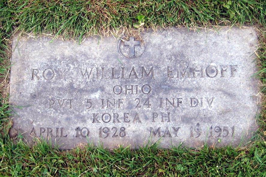 Private Emhoff, two days into the enemy assault and exactly twenty years after the death of his older brother, was killed in action by an North Korean mortar round. A number of men from Private Emhoff’s company were also killed in the May 19th battle, including the company’s Lieutenant and a Sergeant, both of whom were decorated for bravery. After three days of brutal warfare, some of it hand-to-hand, the enemy’s advance was finally checked. The 5th RCT’s stand that day in May 1950 blunted any further enemy advance. Private Roy Emhoff is buried at Evergreen Burial Park, New Philadelphia.